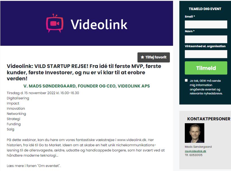 Jeg lover, at det bliver spændende, måske endda lidt uhyggeligt, men under alle omstændigheder lærerigt, når jeg deler ud af mine mange erfaringer som serie-entreprenør. Jeg kommer med gode råd til, hvad man skal have fokus på, når man starter virksomhed, og jeg tager udgangspunkt i min fantastiske vækstrejse i Videolink, hvor emner, så som “hvordan skaffer man investorer”, “hvordan finder man ud af kundernes behov”, MVP, ROI, team, konkurrenter m.fl. Det bliver måske ligefrem “neglebidende”, men I kan jo altid slukke for lyden, hvis det bliver for uhyggeligt:-). Èn ting er i hvert fald sikker, det er ganske gratis, og tilmeldingen sker ved at klikke på nedenstående foto eller via dette link: https://gew.dk/mads-soendergaard-founder-og-ceo-videolink-aps/videolink-vild-startup-rejse-fra-ide-til-foerste-mvp-foerste-kunder-foerste-investorer-og-nu-er-vi