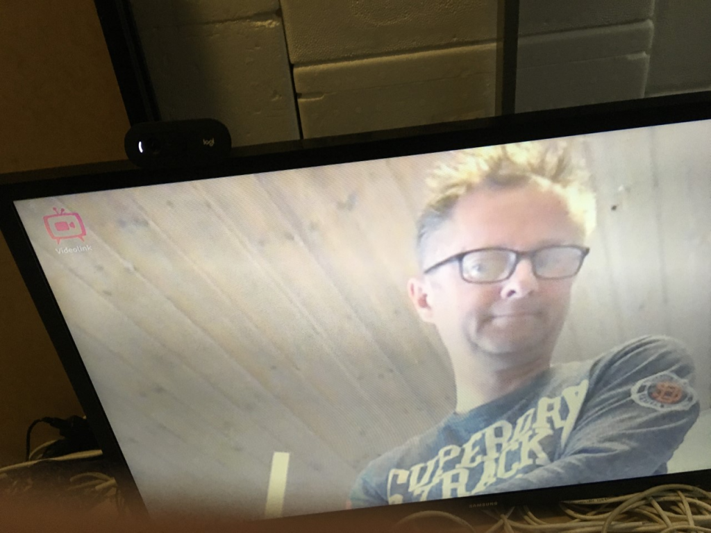 Og hos vedkommende, som modtager video-opkaldet på ens TV, vil skærmen komme til at se sådan nogenlunde ud om dette: