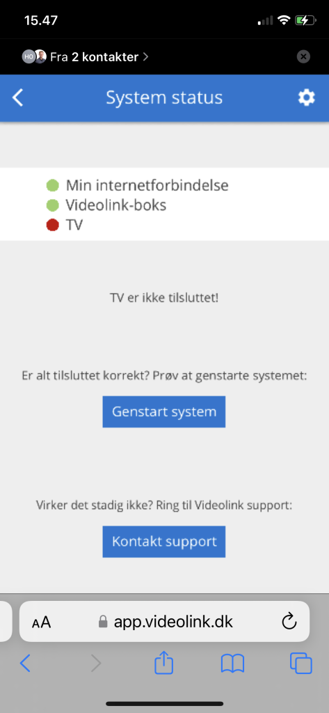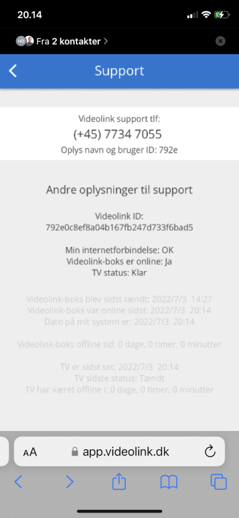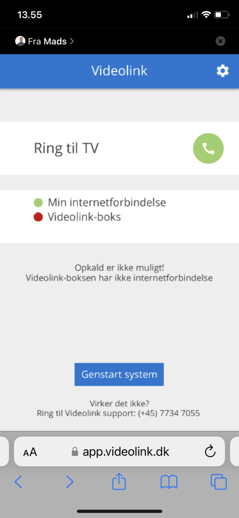 - Skulle ingen af ovenstående funktioner vise sig at være nok til at få Videolink udstyret til at virke, så kommer der automatisk vores support tlf. nr op, som i kan trykke på og ringe op til, så hjælper vi jer med at få jeres udstyr til at virker igen.