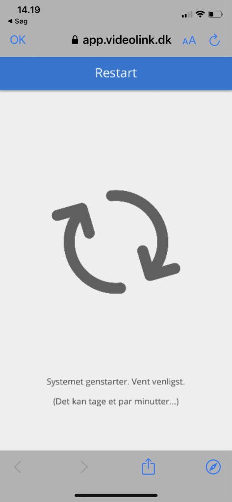 - I får en ny funktion i Videolink appen, så i kan genstarte Videolink udstyret, såfremt i måtte opleve, at I ikke kan video ringe op. Dette sker yderst sjældent, men nu har man så en mulighed for selv at genstarte udstyret (på samme måde, som hvis ens pc driller og kræver en genstart), inden i ringer til vores support (som i selvfølgelig altid er velkommen til at ringe til, da telefonisk og personlig support er med i Videolink abonnementet, så tøv endelig ikke med at ringe til os (tlf. nr. fremgår nederst højre hjørne på vores webside).