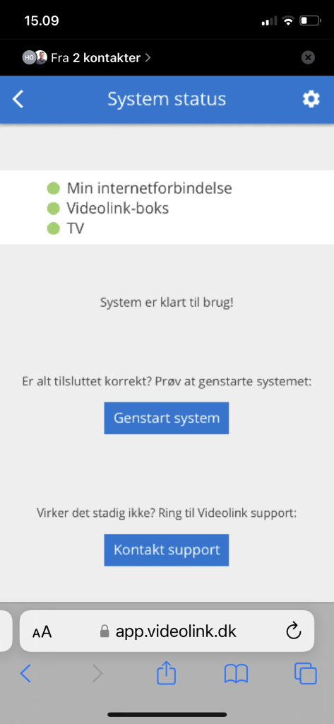 I aften, mandag d. 4. juli, foretager vi endnu en opgradering af Videolink. Denne gang, er der tale om helt nye funktioner i selve Videolink appen, som gør, at den der videoringer op, kan se status på Videolink systemet hos den, som modtager videoopkaldet. Nederst i Videolink appen er der nu en blå knap, som viser “System status”. Hvis man klikker på den, så kan man se status på Videolink systemet hos den person, som man videoringer til. Der er tale om en større opgradering af Videolink appen, som yderligere giver de pårørende mulighed for eks. at genstarte og tjekke Videolink systemet hos modtageren af Videolink opkaldet.
