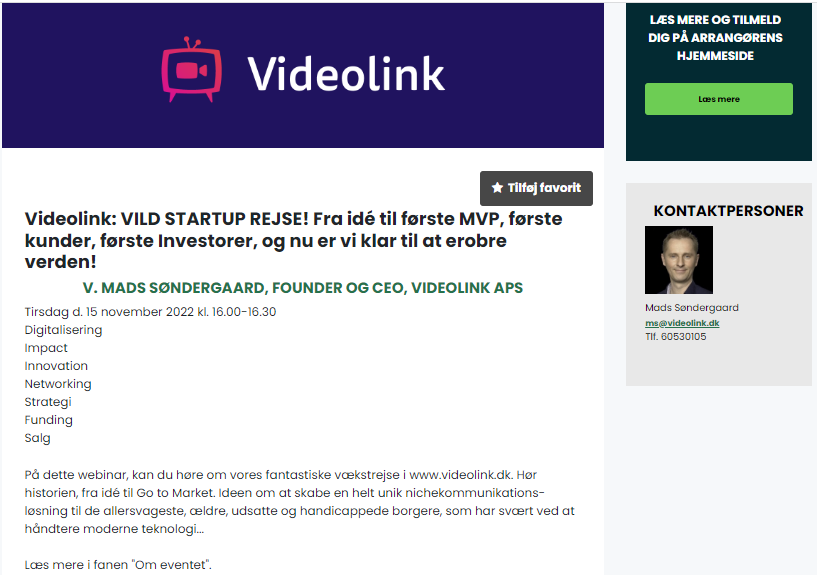 We are so grateful that www.videolink.dk has been selected to participate in the selection pitch for Danish Tech Challenge 2023. We are now part of the last 30 remaining startups in this application round. We are going to pitch June 7th at DTU Science Park in Hørsholm. 20 startups will be accepted to participate in the program: https://dtusciencepark.com/futurebox/danish-tech-challenge/